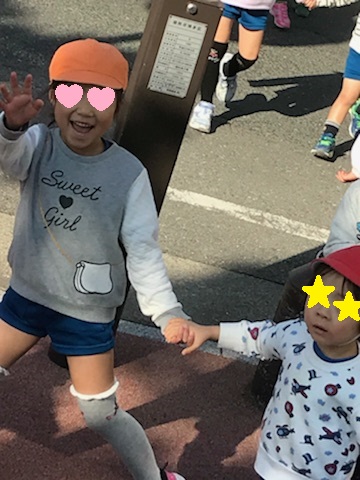 年長さんの娘は、年少さんと手をつないで、池の上公園へ向かいます・・・